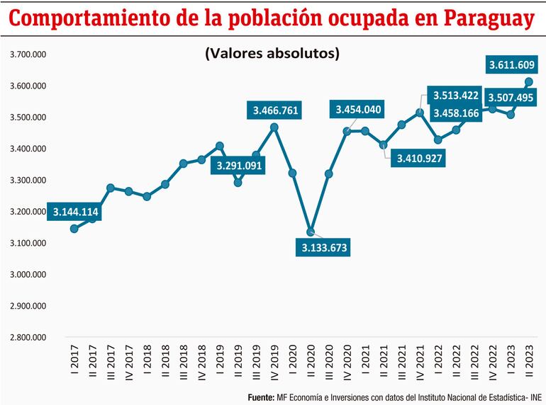 En cuanto al comportamiento del mercado laboral en Paraguay, es de recordar que de un total de 7.456.666 personas que habitan en nuestro país (se excluye a los habitantes de los departamentos de Boquerón y Alto Paraguay), 5.374.551 integran la población de 15 y más años de edad y 2.082.115 personas son menores a la mencionada franja. Esto, de acuerdo con los principales resultados de la Encuesta Permanente de Hogares Continua (EPHC), correspondiente al segundo trimestre del año 2023 y presentados por el Instituto Nacional de Estadística (INE).