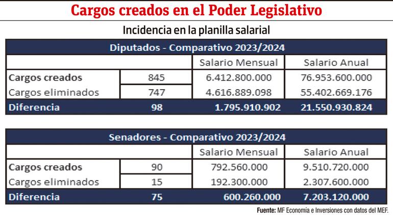 En la Cámara de Senadores, igualmente, se crearon y eliminaron líneas presupuestarias, traduciéndose en 90 y 15 cargos, respectivamente, que finalmente se ubicaron en 75 nuevos puestos para el presente ejercicio fiscal. La incorporación representa un pago mensual adicional en concepto de sueldos de G. 600 millones y G. 7.203 millones de forma anual.