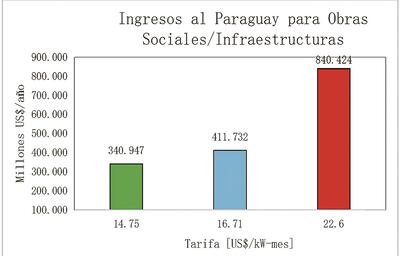 La tarifa incide en la posibilidad de crear un fondo para las obras sociales/infraestructuras. Una reducción de la tarifa abre la posibilidad de contratar toda la potencia que le corresponde al Paraguay y negociarla a un precio mejor que la tarifa de cesión, como también la posibilidad de crear un fondo para financiar las obras correspondientes a la expansión del sistema eléctrico paraguayo.