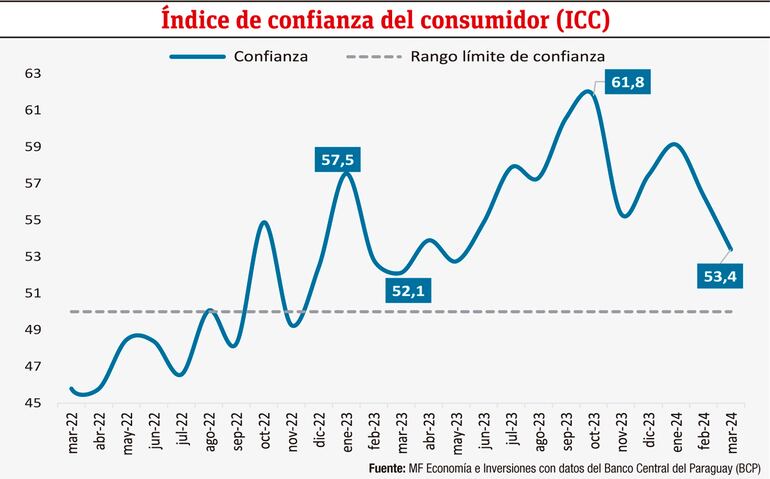 Además, el Índice de Confianza del Consumidor (ICC) señala que finalizó marzo en zona optimista. Sobre el punto y conforme con los datos del Banco Central del Paraguay, el ICC cerró el tercer mes del año 2024 en 53,5 puntos, resultado superior al registrado en marzo del año pasado.