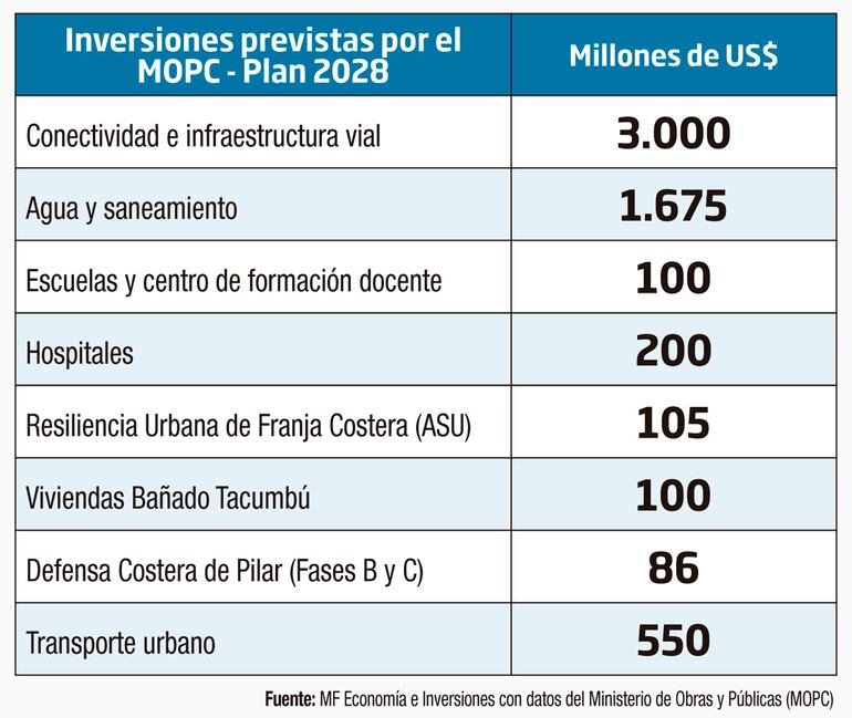 Desde el Ministerio de Obras y Públicas y Comunicaciones (MOPC) habían presentado el Plan de Infraestructura Vial 2028, que contempla una inversión de unos US$ 5.500 millones, alrededor de 4% del PIB.