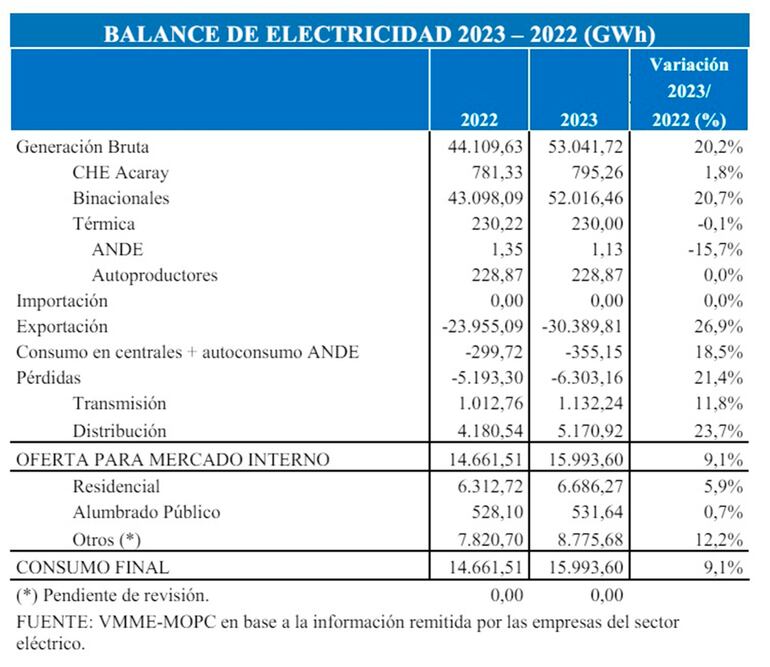 El crecimiento en la generación bruta total registrado que alcanzó de conjunto el 20,2% respecto al año anterior, en contraposición con el crecimiento del 9,1% registrado en el consumo final respecto a igual período. El comportamiento descrito deriva en un incremento respecto al año 2022 en los excedentes de electricidad disponible con destino a la exportación, la que crece en 26,9% en relación con lo registrado en el año anterior.