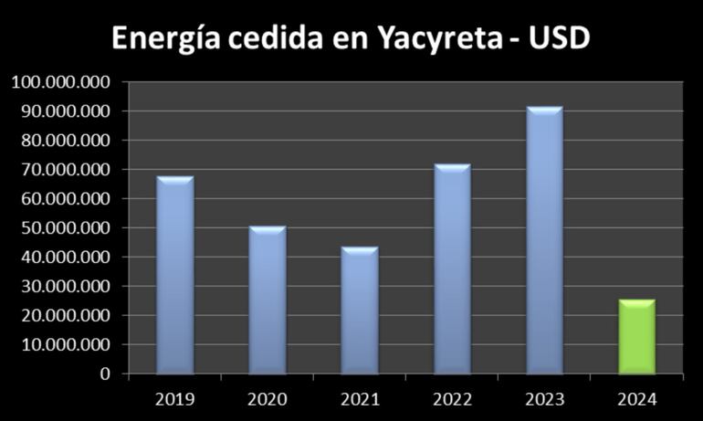 De enero a julio de 2024, la ANDE retiró desde Yacyretá el valor de 2,5 veces lo retirado en el mismo periodo en el año pasado, siendo los meses de junio y julio los que mayor retiro de energía registran (la energía retirada en junio batió el récord mensual de uso en Paraguay con 560 GWh).