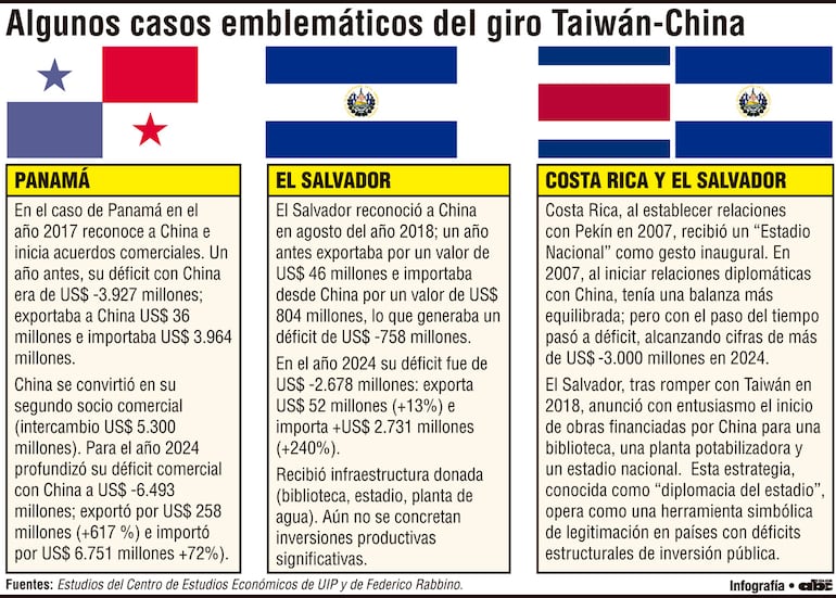 Destacan el ejemplo de Panamá (que cortó relaciones con Taiwán en 2017 para establecerlas con China), donde las inversiones han sido calificadas como “modestas” y los beneficios “apenas tangenciales” (es decir, que existen, pero que son mínimos y no fundamentales ni directos).