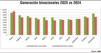 - Entre enero y noviembre de 2025, la central paraguayo-brasileña produjo 10% más de energía, en tanto que La paraguayo-argentina generó 1% más que en similar período de 2024 (enero-noviembre.