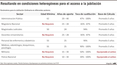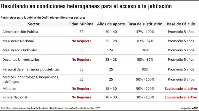 Todos ellos, bajo el régimen vigente, no requerían de una edad mínima para la jubilación, solo bastaba alcanzar el mínimo de aportes que variaba entre 10 y 25 años. De ahí que algunos docentes y policías ya se jubilaban con solo 40 y 45 años de edad.