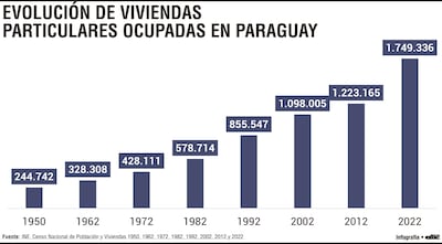 En 1950, la cantidad de viviendas particulares ocupadas en Paraguay era de 244.742; en 1962 ascendía a 328.308; en 1972, a 428.111; en 1982, a 578.714; en 1992, a 855.547; en 2002, a 1.098.005; y en 2012, a 1.223.165. El mayor salto absoluto se observa entre 2012 y 2022, cuando el parque habitacional creció en más de 526.000 unidades, reflejando una aceleración significativa en la construcción y ocupación de viviendas.