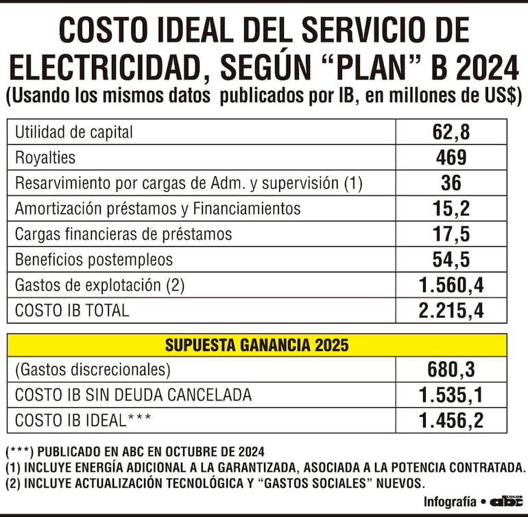 Según la Itaipú: “El ejercicio 2024 presentó un saldo positivo de US$ 639,4 millones, resultante de la diferencia entre el ingreso operacional de US$ 2.854,8 millones y el costo del servicio demostrado en la tabla, de US$ 2.215,4 millones. Con este resultado el saldo acumulado de la cuenta de explotación que era de US$ 40,9 millones en 2023, pasó a US$ 680,3 millones al final del ejercicio de 2024”. Esta cifra realmente es la pérdida de la ANDE y ENBPar por sobrefacturar la tarifa y es exactamente lo que venimos denunciando desde setiembre del 2024.