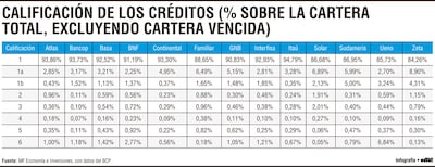 Ueno presenta 85,73% y Zeta 84,26%, el porcentaje más bajo dentro de esta categoría. En este último caso, cerca de 16% de la cartera se distribuye en categorías de mayor riesgo.