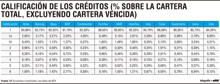 La comparación entre ambos extremos de la clasificación permite identificar perfiles diferenciados. Itaú combina 94,79% en categoría 1 con solo 0,67% en categoría 6, lo que evidencia una cartera fuertemente concentrada en activos de alta calidad y con mínima exposición al tramo irrecuperable. Atlas y Bancop también muestran una relación favorable entre elevada proporción en el segmento más sólido y niveles acotados en el más crítico.