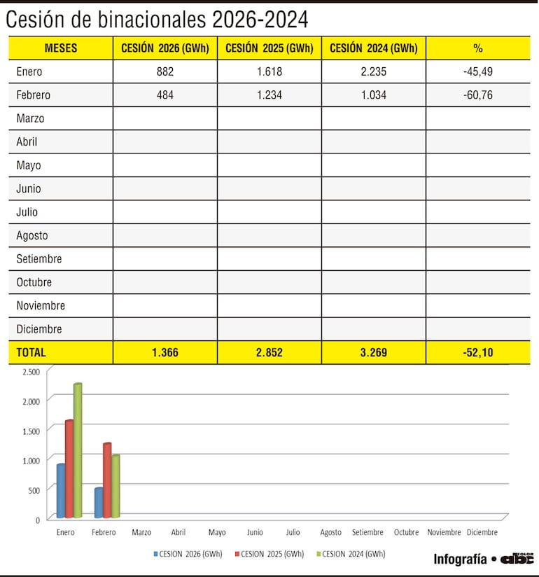 -La cantidad cedida en el primer bimestre de 2026 fue el 18% de la que correspondía a nuestro país en Itaipú y Yacyretá: 17% de la de Itaipú y 23% de la de Yacyretá.