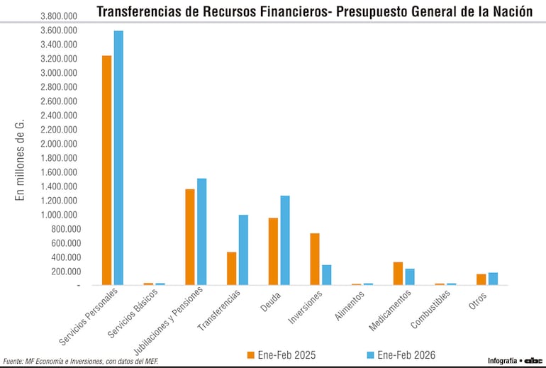 En contraste, el rubro de “inversiones” presentó una caída significativa. La ejecución se redujo de G. 732.075 millones en 2025 a G. 286.624 millones en 2026, lo que implicó una disminución de G. 445.451 millones, equivalente a -60,8%. Esta contracción es particularmente relevante, dado que la inversión pública suele estar vinculada a infraestructura y proyectos de capital con impacto en el crecimiento económico, reducción que en este componente tiene implicancias en la dinámica de la actividad económica, especialmente en sectores como la construcción.