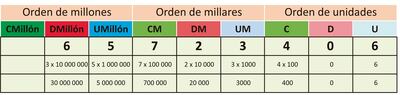 Se multiplica esa cifra por el valor en unidades del orden: 5 x 1 000 000 = 5 000 000 de unidades