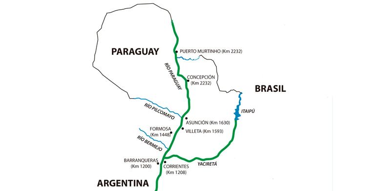 El siguiente mapa de la hidrovía Paraguay-Paraná representa la principal ruta de comercio fluvial para el Paraguay, tanto en el pasado como en la actualidad. Con ayuda del mapa realiza las siguientes actividades: