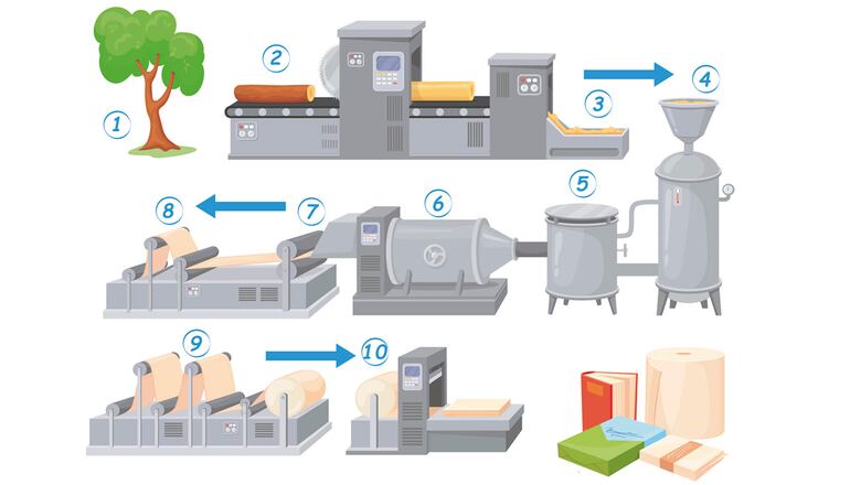 En el proceso de fabricación del papel se saca la corteza de la madera de los árboles talados, se tritura y se mezcla con agua y productos químicos para ser transformada en pasta de celulosa. Esta pasta es prensada y laminada a máquina hasta convertirla en papel.
