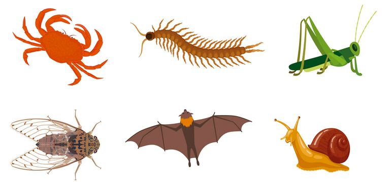1. El cangrejo. 2. El caracol. 3. El murciélago. 4. La cigarra. 5. El ciempiés. 6. El saltamontes.