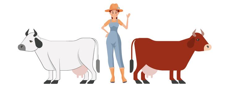 Lucía ordeñó dos vacas, llenó el balde gris con la leche que dio la vaca blanca y el balde azul con la leche que dio la vaca marrón.