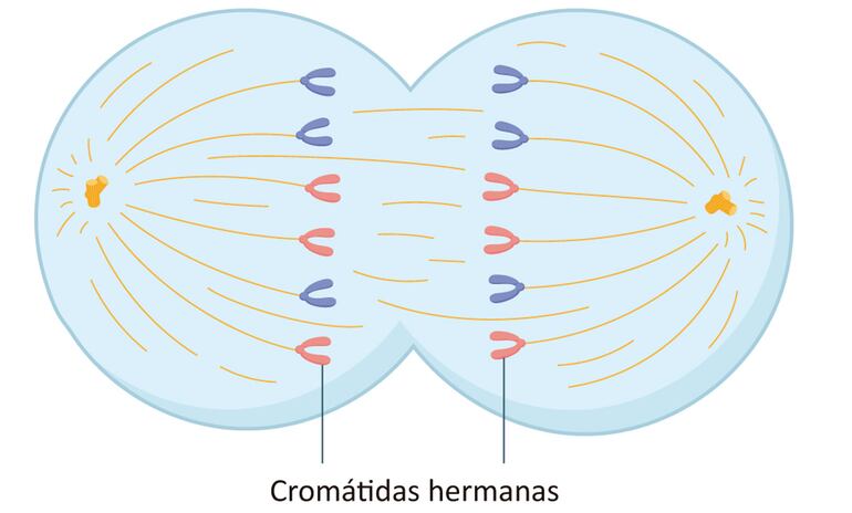 Las cromátidas hermanas se separan y se desplazan hacia los centriolos, al tiempo que van desapareciendo las fibras del huso. En este momento ya se ha repartido el material hereditario (las cadenas de ADN de las cromátidas) de forma idéntica en dos partes.