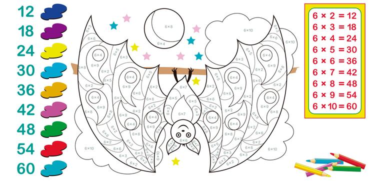 1. Pinta cada parte del murciélago y del búho con los colores que indican cada uno de los resultados de la multiplicación.