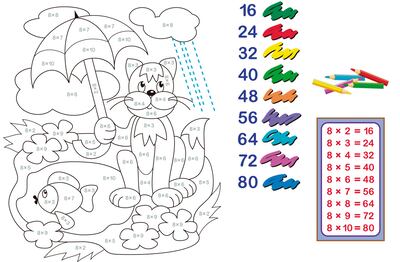 Pinta cada parte del paisaje de la lluvia, del globo aerostático y de la tortuga con los colores que indican cada uno de los resultados de la multiplicación.