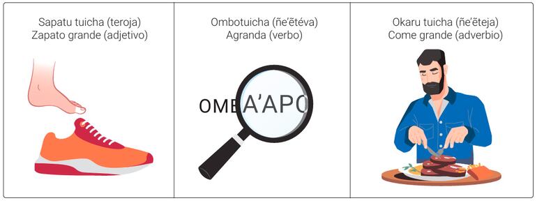 Tembiecharã, «tuicha» omba’apo tera’ykéramo (teroja) «sapatu tuicha» oje’évo, ojeporu ñe’ẽtévaramo oje’éramo «ombo-tuicha» ha ikatuñe’ẽteykéramo (ñe’ẽteja), oje’évo«okaru tuicha».