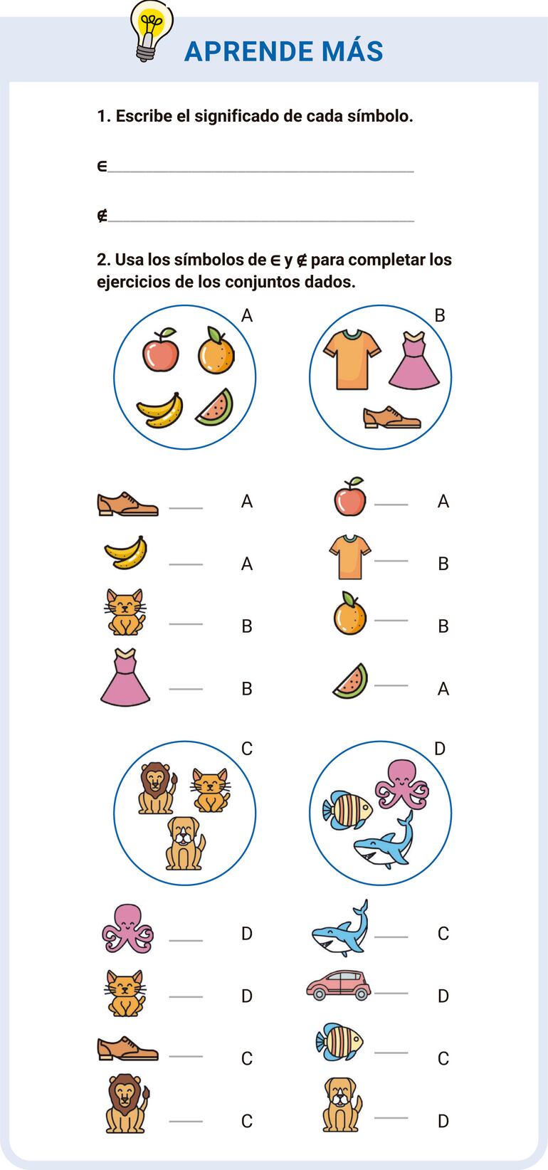 La expresión 1 ∈ a E debe ser leída como «1 pertenece a E» o «1 está en E». Puedes apreciar también que a no está en el conjunto E, la expresión a ∉ a E debe leerse como «a no pertenece a E» o «a no está en E».