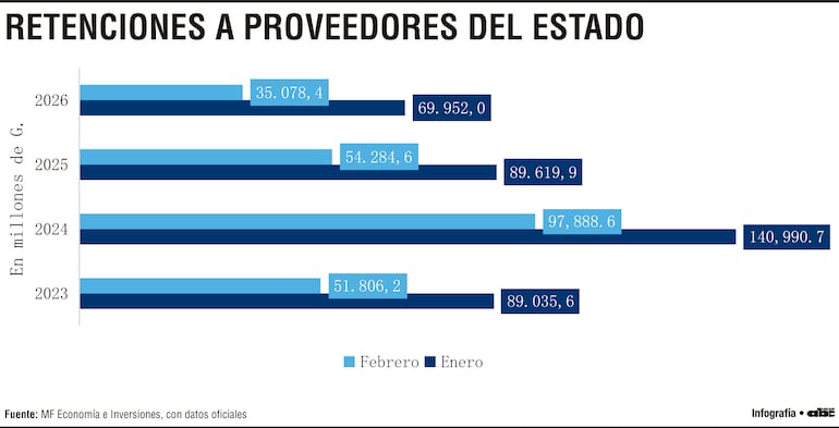 En febrero la reducción fue aún más pronunciada: las retenciones alcanzaron G. 35.078 millones, 35% menos que los G. 54.284 millones del mismo mes del año pasado. En conjunto, estas cifras evidencian una menor generación de ingresos tributarios vinculados a pagos del sector público.