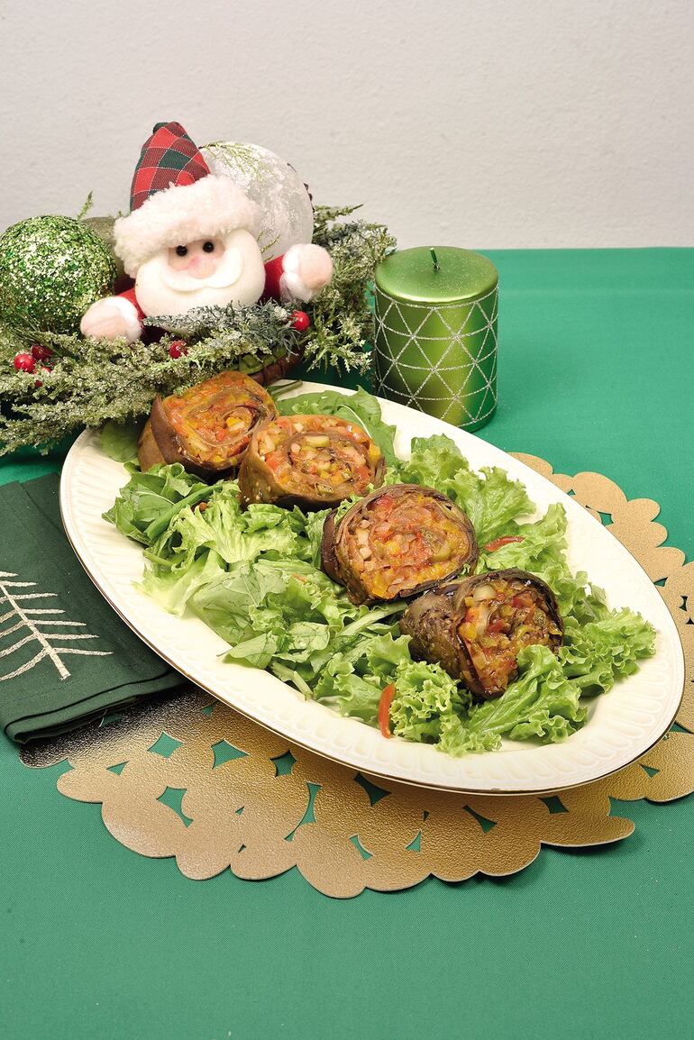 5. Distribuir la caponata sobre las láminas de berenjena. Enrollar en forma compacta y con ayuda de papel film. Cerrar la envoltura y reservar en la heladera por medio día.