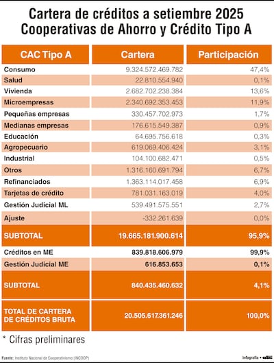 Al analizar la cartera por destino del crédito, se observa una fuerte concentración en el segmento de consumo, que totalizó G. 9,3 billones, equivalente a 47,4% del total de la cartera en moneda nacional. Este dato posiciona al crédito de consumo como el principal motor de la actividad crediticia de las cooperativas Tipo A, reflejando su papel en el financiamiento de los gastos corrientes de los hogares.