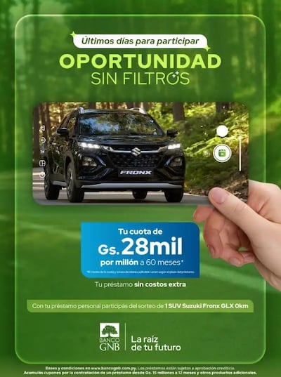 Quienes solicitan un préstamo personal en el marco de la campaña participan automáticamente del sorteo de un vehículo Suzuki Fronx GLX 0 km, acumulando cupones conforme a las bases y condiciones vigentes.