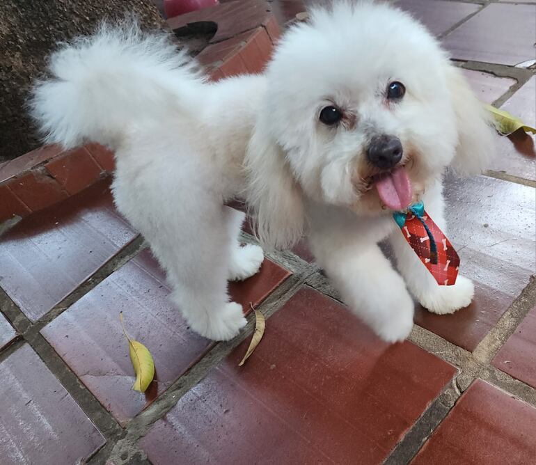 Había salido recién de la veterinaria y tenia un collar celeste y corbata. Tiene 13 añitos y toma medicación para el corazón.