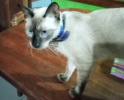 Esta castrado, lleva un collar azul, renguea de la pata posterior izquierda. Está rapado en el abdomen porqué se le hizo una ecografía por una infección urinaria. Necesita tomar su antibiótico y otros medicamentos. Su familia ofrece una recompensa de G. 500.000 por información de este felino. Contacto: 0971 215 980.