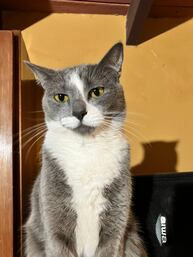 Neo es de color gris con blanco y tiene ojos verdes medio amarillentos. Está castrada.
