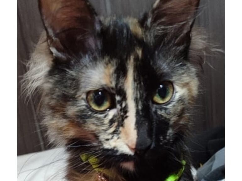 Está castrada, tiene 9 meses y pelaje largo; en su cara hay una línea divisoria que se llama quimerismo, y da la impresión de que tiene dos rostros. Tiene problemas de visión, por ello se asusta y puede ser agresiva. Estaba tomando medicación cuando desapareció el pasado 13 de febrero en el barrio Bernardino Caballero.
