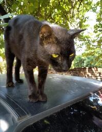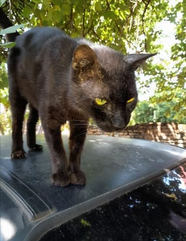 Señor Michón es un gato macho de 12 años, toma medicación, negro canoso. Tiene una mancha blanca en el cuello, tipo corbata.