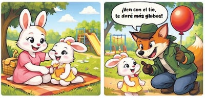 De pronto vio un globo rojo, se separó de su mamá y cuando lo estaba mirando apareció un zorro con sombrero que ella no conocía. El zorro le sonrió y le dijo que tenía más globos y dulces «por aquí cerquita», y que podía llevarla a verlos. Luna allí recordó la regla que la profe repetía siempre: «Las personas extrañas no pueden llevarte a ningún lado, aunque parezcan amables».