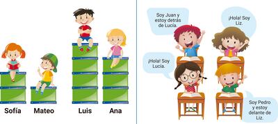 Observamos las imágenes y con la ayuda de la profe descubrimos a los niños que están arriba, abajo y los que están delante de y detrás de...