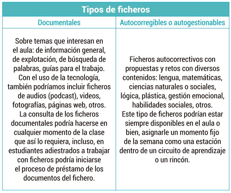 Los ficheros son una alternativa a los libros de texto, fomentan la investigación y ofrecen al estudiante la posibilidad de desarrollar destrezas y habilidades que hacen a la investigación y el manejo de la información documental. En los ficheros los estudiantes pueden encontrar dibujos, artículos, publicaciones, investigaciones, fichas, revistas, datos estadísticos, mapas, infografías, otros.
