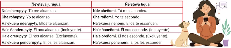 aipohãno (curo), añepohãno (soy curado), aikutu (clavo), ajekutu (soy clavado), aikytĩ (corto), añekytĩ (me he cortado), aipeju (soplo), ajepeju (soy soplado).