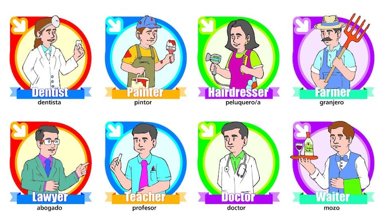 Profesiones: dentista, pintor, peluquero, granjero, abogado, profesor, doctor y mozo.