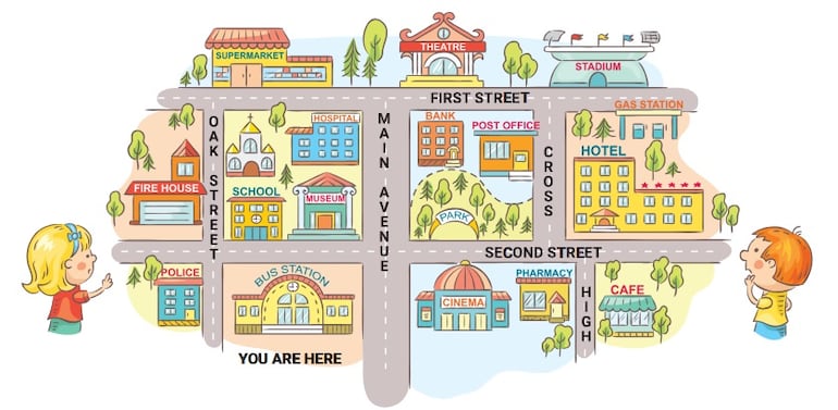 1. The ________________ is on First Street. It’s between the supermarket and the stadium.