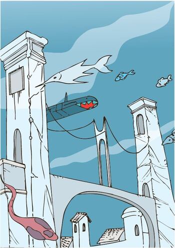 El origen del resplandor rojo que iluminaba todo era un cráter submarino que expulsaba torrentes de lava. Allí, bajo mis ojos, como un cementerio en ruinas, apareció una ciudad arrasada, con sus templos destruidos, sus construcciones sin techos, sus columnas derribadas. Más allá, los restos de un gran acueducto, los vestigios de un muelle, largas filas de murallas caídas. Toda una Pompeya oculta bajo el mar, que el capitán Nemo descubría ante mi vista.