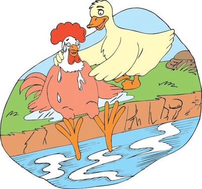 En ese momento, pasaba un gallo que también hizo lo propio al meterse en el centro del cauce sin percatarse que allí lo arrastraría la corriente y con la desesperación gritó: ¡auxilio, ayúdenme por favor! Y el pato al oír el clamor del gallo dijo: ¿cómo hago para salvar al gallito?