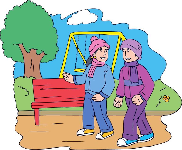 Margarita y Roberto van al parque a jugar. El día está soleado y el clima frío.