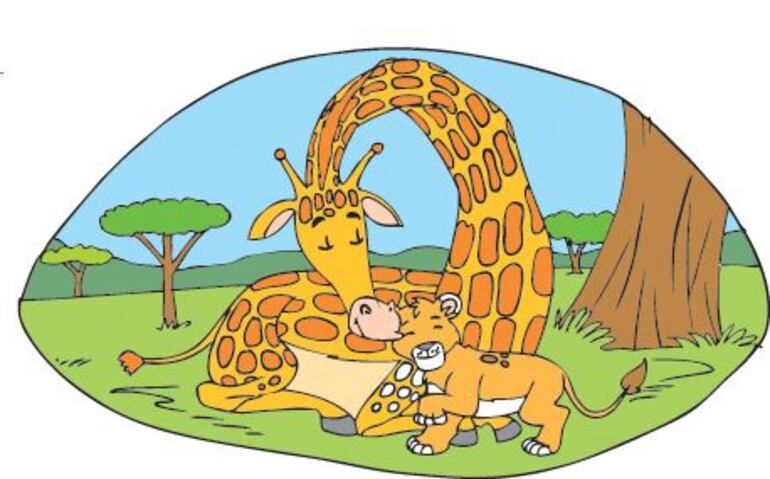 Pasaron varios días, Jirafa cuidaba de él, lo alimentaba y le daba cariño como si fuera su mamá. Un día le explicó que dentro de un tiempo tendría que volver con su familia de leones.