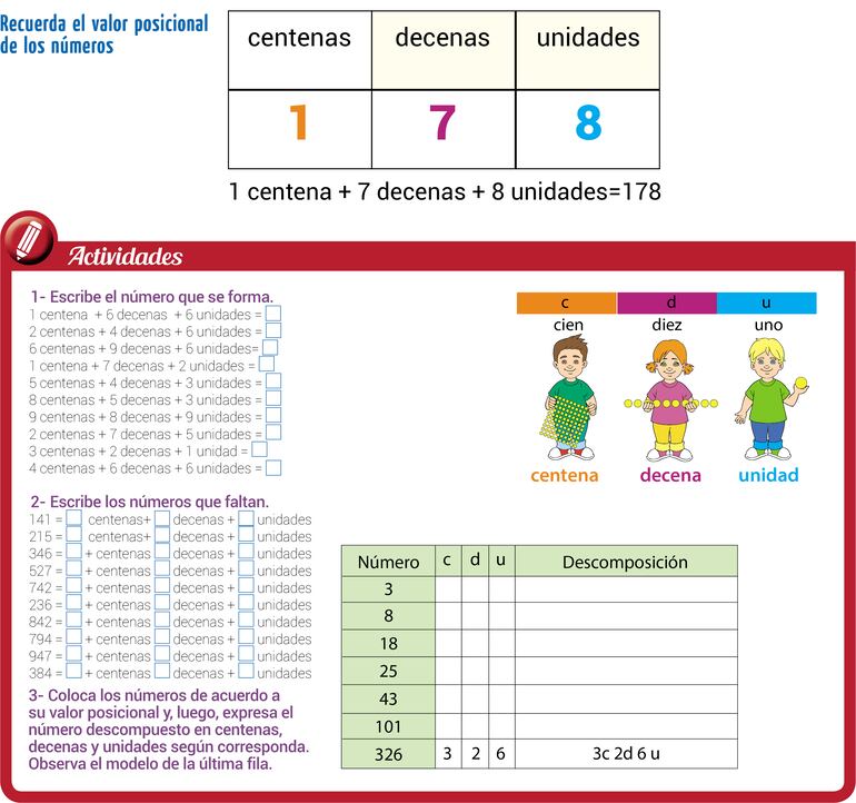En un número natural el último dígito de la derecha ocupa siempre el lugar de las unidades. El siguiente que está hacia la izquierda de las unidades ocupa el lugar de las decenas, a la izquierda de las decenas están las centenas. Los dígitos restantes continúan llenando los valores posicionales que seguiremos estudiando.