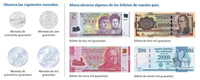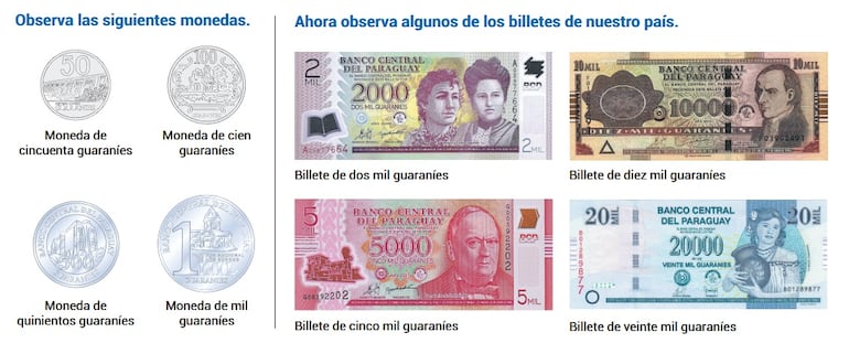 1. Fui a la tienda y compré unas medias por valor de cuarenta y cinco mil guaraníes. Pagué con ___ billetes de 10 000 y___billete de 5000 guaraníes.