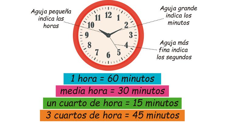 La hora en punto: cuando la aguja corta marque una hora cualquiera y la larga esté en el doce, se dice que son las horas en punto. Por ejemplo: las dos en punto, las nueve en punto..., o simplemente las dos, las nueve...