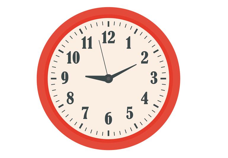 Si el reloj marca las 10:45, la aguja corta (señala la hora) debe estar en 10 y la aguja larga (señala los minutos) debe estar en 9, y se calcula resolviendo la división 45÷5= 9