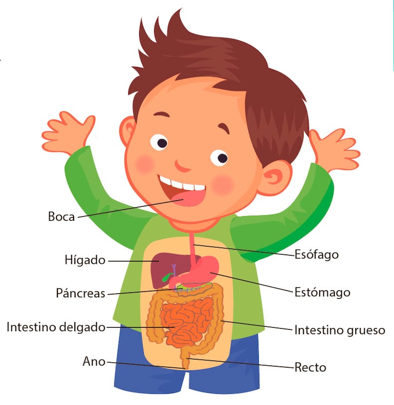 La boca contiene la lengua, los dientes y las glándulas salivales. La faringe es el conducto que está detrás de la boca. El esófago es la parte del tubo digestivo entre la faringe y el estómago.